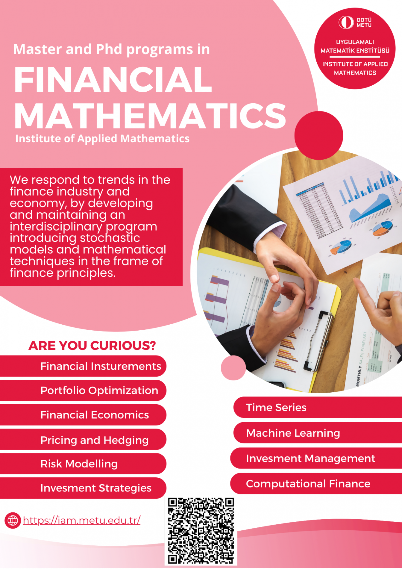 The Institute of Applied Mathematics (IAM), ever since its establishment in 2002, has been responding to this emerging trend in the Turkish finance industry and economy, by developing and maintaining an interdisciplinary program that is introducing students to stochastic models and mathematical techniques used in option pricing, pricing of other complex financial products, portfolio optimization and control, and to financial decision aiding in the sectors of energy and environment. The Financial Mathematics program at IAM combines the strengths of the Departments of Mathematics, Business Administration, Economics, Statistics, Physics and Industrial Engineering of Middle East Technical University, and it closely collaborates with Centers of Excellence worldwide.
